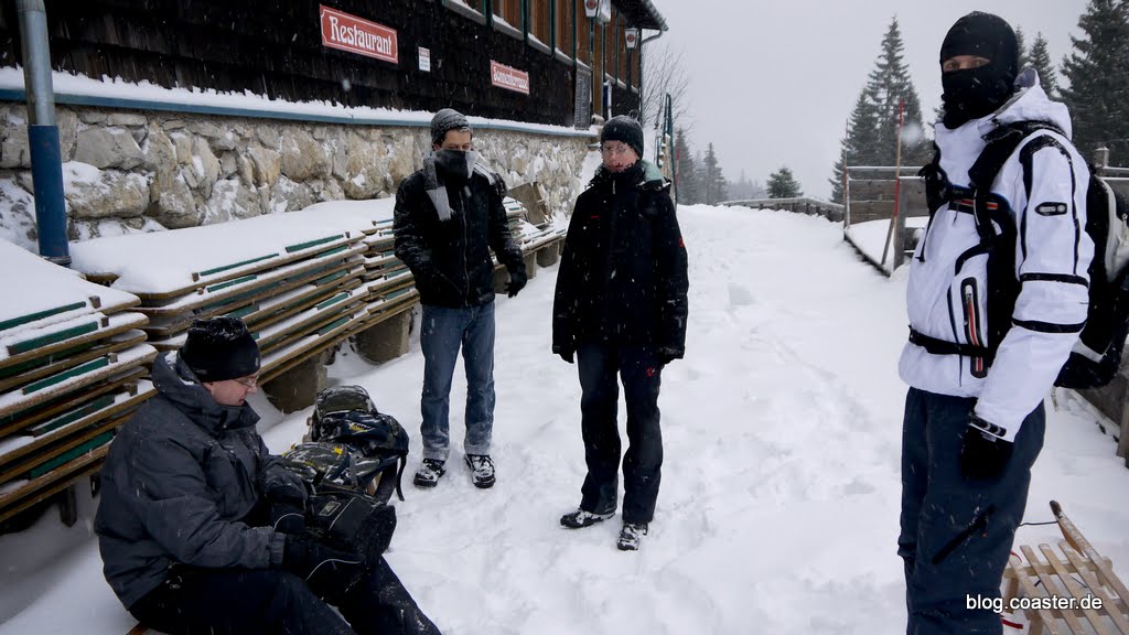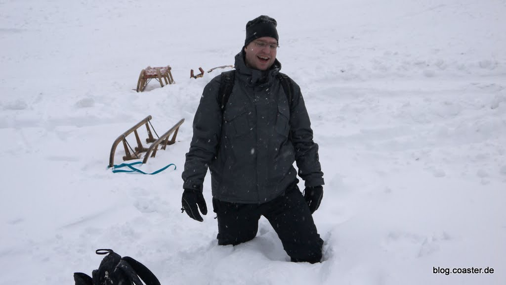 Außerdem: Axel versinkt im Schnee. JMS rennt um sein Leben. Und wir Rodeln die Piste herunter (rechts).
